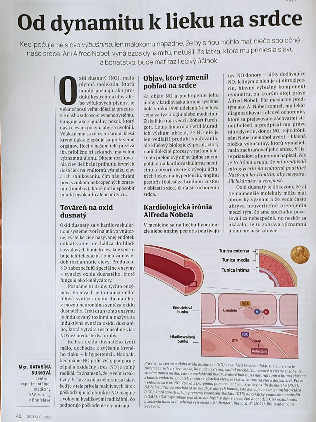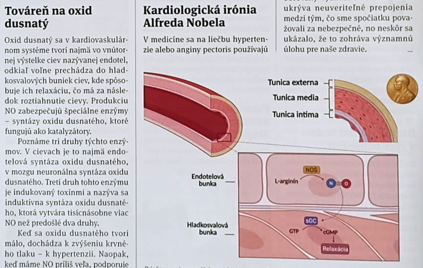 Okrem sírovodíka je ďalším významným transmiterom zapojeným do regulácie cievneho tonusu aj oxid dusnatý. Je to zároveň ďalšia signálna molekula na ktorú sa v rámci projektu zameriava naša pozornosť, predovšetkým na jej interakciu so sírovodíkom a jej význam. Prečo je oxid dusnatý (NO), známy skôr ako súčasť výfukových plynov či výbušnín, v skutočnosti kľúčový pre zdravie srdca a ciev? Článok „Od dynamitu k lieku na srdce“, ktorý napísala členka riešiteľského kolektívu Katka Bujnová, vysvetľuje, ako NO rozširuje cievy, znižuje krvný tlak, chráni pred vznikom krvných zrazenín a akú úlohu zohráva pri vzniku vysokého tlaku, zápalu a oxidačného stresu. Prečítajte si ho v decembrovom vydaní (2025) časopisu Quark Časopis Quark. V článku sa hovorí aj o tom, ako objav významu oxidu dusnatého v kardiovaskulárnom systéme viedol k udeleniu Nobelovej ceny za fyziológiu a medicínu a prečo je príbeh nitroglycerínu – výbušniny spojenej s Alfredom Nobelom, ktorá sa dnes používa ako liek na srdcové ochorenia – takou fascinujúcou iróniou osudu.